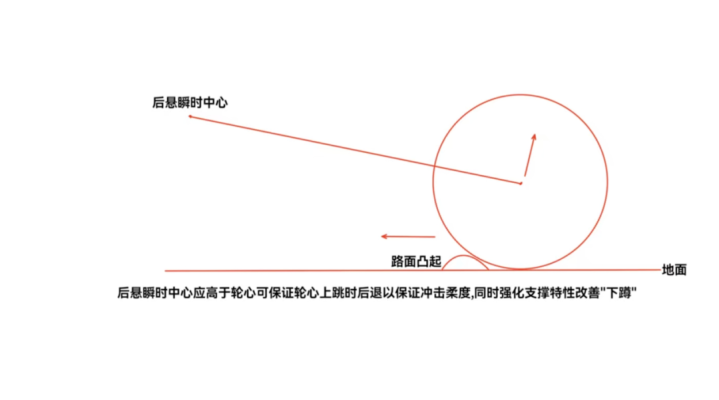 对后悬而言,瞬时中心应该高于后轮的轮心,既可以保证后轮轮心在上跳时后退,让冲击感更柔和,也可以在加速时防止车身“下蹲”。因此对后悬而言,瞬时中心高于轮心,可以兼顾支撑特性和退让性。