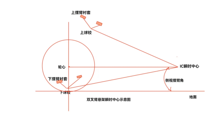 如果是双叉臂悬架,一条线从上球绞出发,平行于上摆臂衬套轴线延伸出来。另一条线从下球绞出发,平行于下摆臂衬套轴线。两条线延伸出来交汇的点,就是双叉臂悬架的瞬时中心(双叉臂可以改变上下摆臂的衬套高度,更灵活调整瞬时中心的位置)。