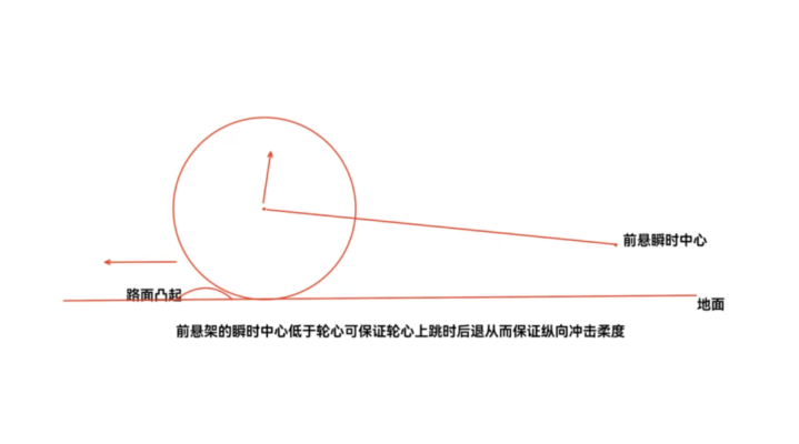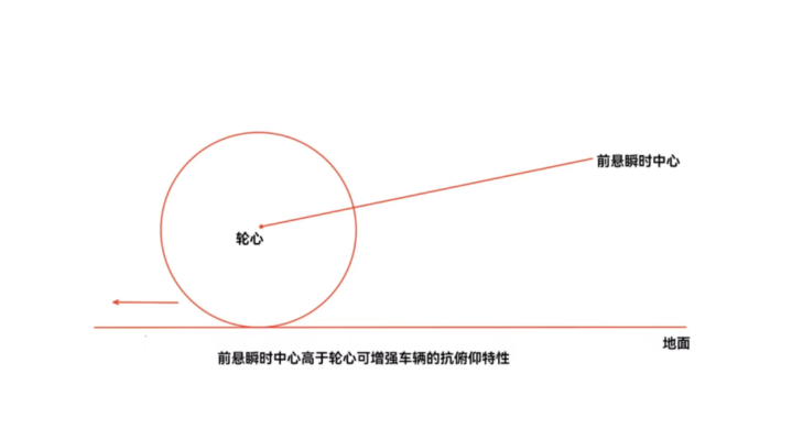 而如果要让前悬有更好的支撑特性,更好的抗俯仰能力,那么前悬的瞬时中心就须高于前轮轮心。所以对前悬而言,需要在退让性和支撑特性之间,做平衡折中。