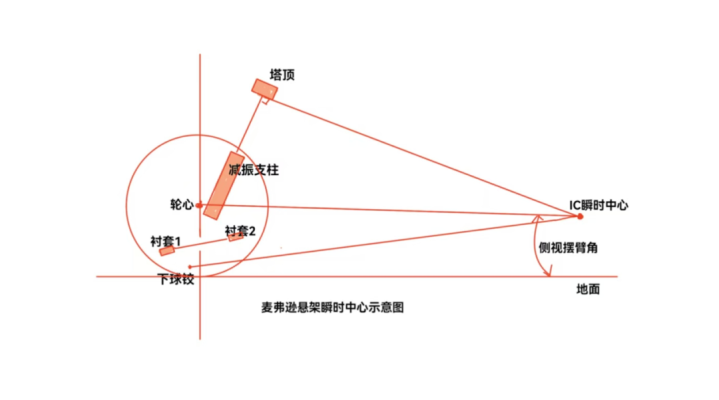 如果是麦弗逊悬架,从塔顶的位置,垂直于减振器支柱画一条线,再平行于下摆臂衬套轴线,从下球绞位置延伸出来一条线,两条线的交点就是瞬时中心。遇到凹凸路面时,车轮弹跳就是围绕这个瞬时中心在做圆周运动。在瞬时中心和车轮轮心之间连一条线,这条线和地面的夹角,就是侧视摆臂角。显然,瞬时中心、侧视摆臂角都是由悬架硬点的几何设计来决定的。